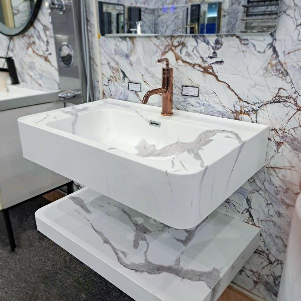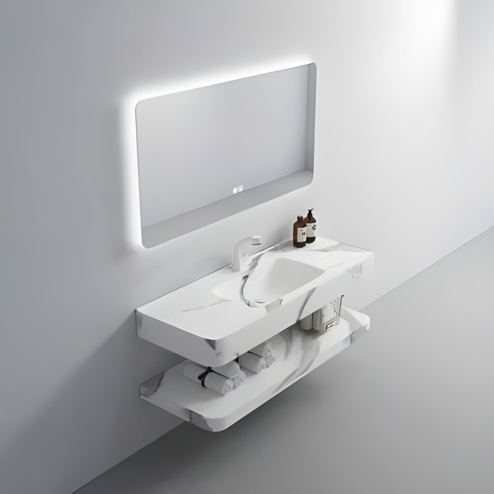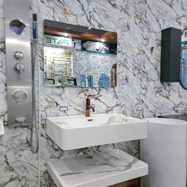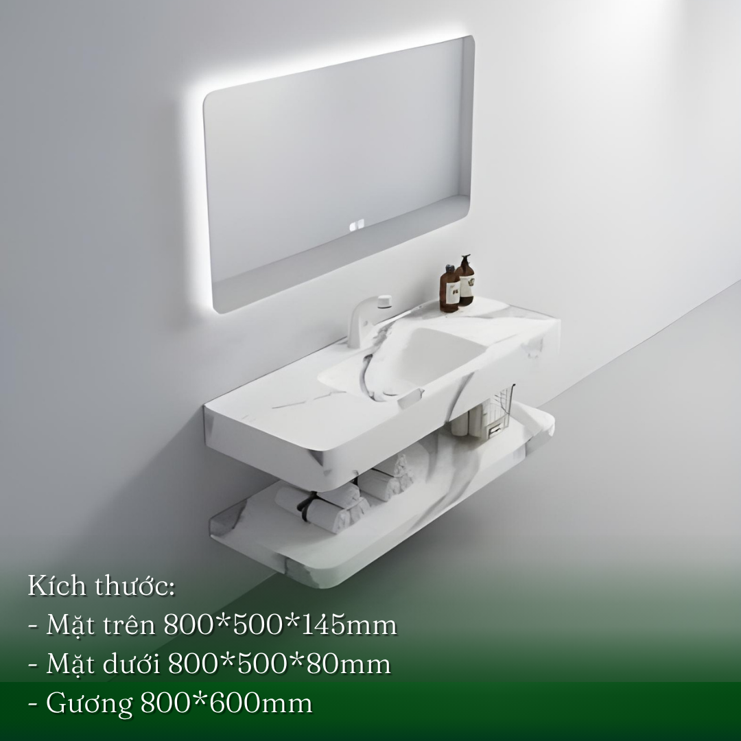 - Chức năng: 2 mặt bàn đá để vật dụng, chậu lavabo liền mặt chống thấm và rò rỉ nước. Gương có trang bị đèn LED tiện lợi, tạo không gian sang trọng và gọn gàng cho nhà tắm của bạn.