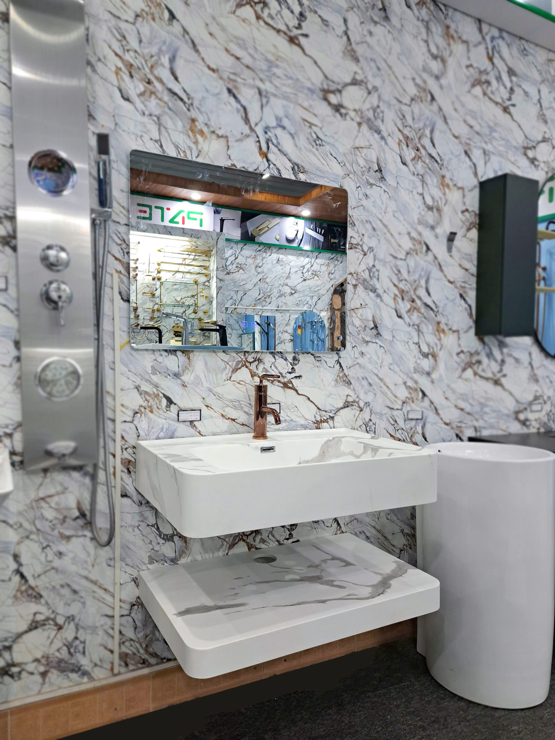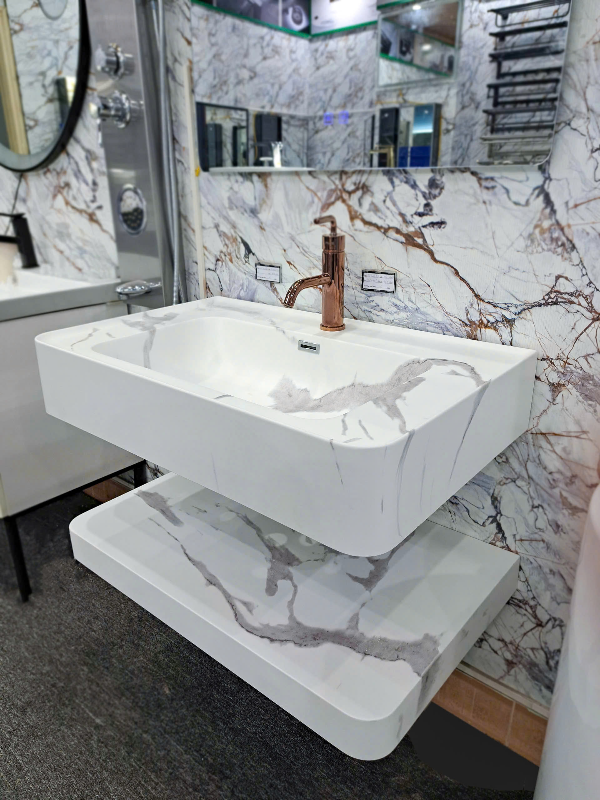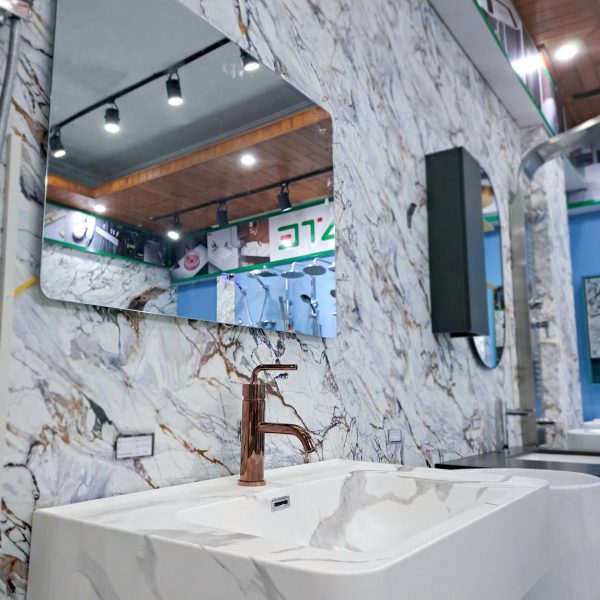- Chất liệu: Mặt bàn đá Corian chống thấm,xước, gương tráng bạc