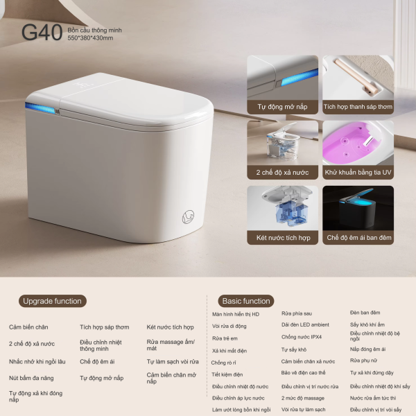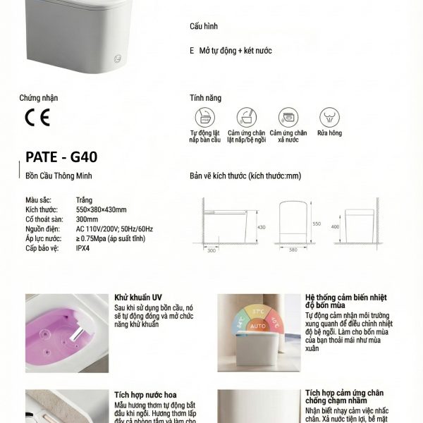 - Tên sản phẩm: Bồn cầu thông minh kích thước nhỏ PATE – G40