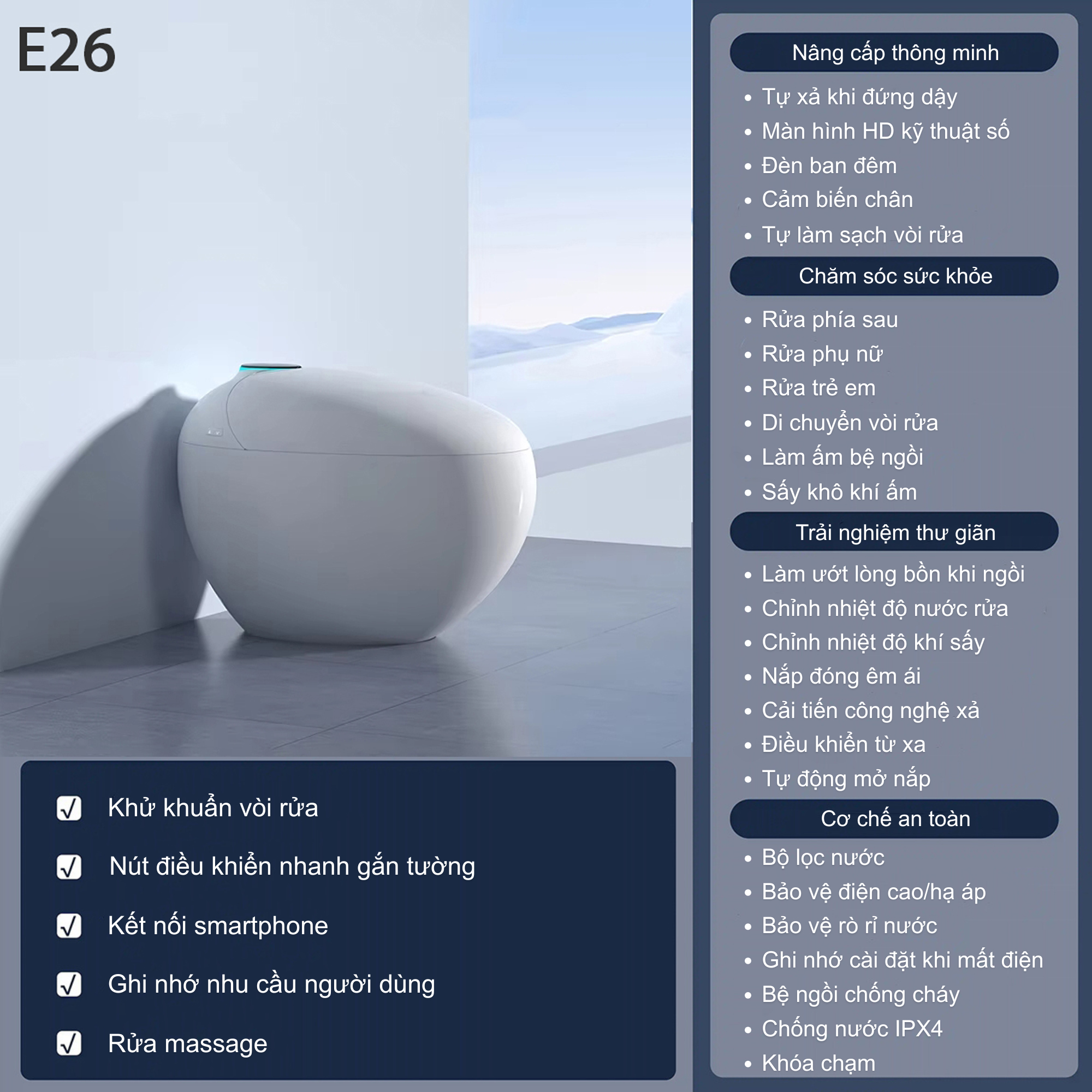 - Tên sản phẩm: Bồn cầu thông minh E26